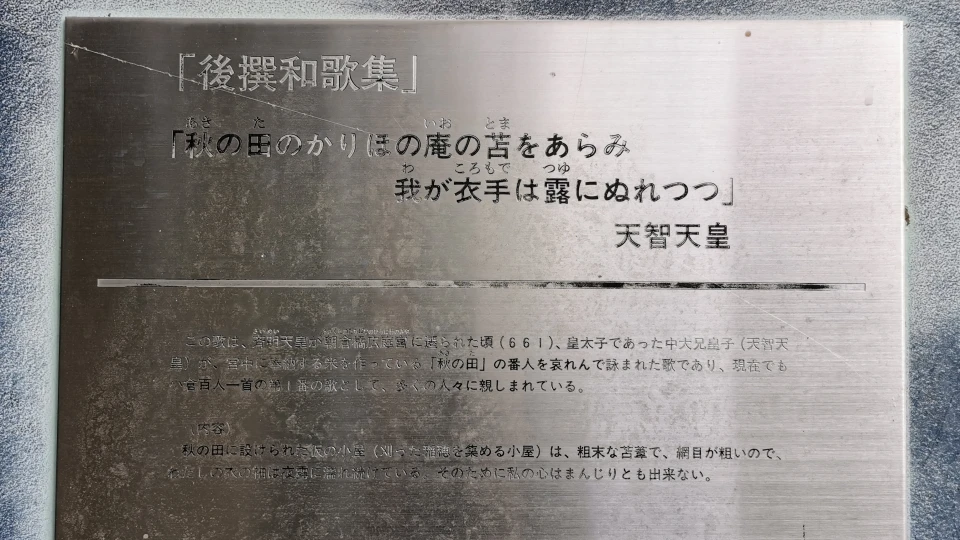 この歌は、斉明天皇が朝倉橘広庭宮に遷られた頃(661)、皇太子であった中大兄皇子(天智天皇)が、宮中に奉納する米を作っている「秋の田」の番人を哀れんで詠まれた歌であり、現在でも小倉百人一首の第1番の歌として、多くの人々に親しまれている。