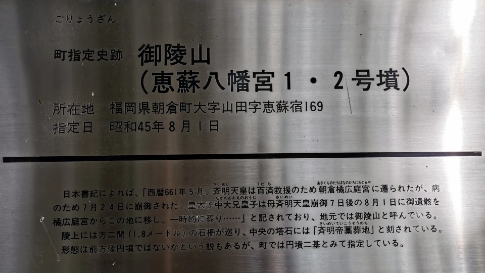 日本書紀によれば、「西暦661年5月、斉明天皇は百済救援のため朝倉橘広庭宮に遷られたが、病のため7月24日に崩御された。皇太子中大兄皇子は母斉明天皇崩御7日後の8月1日御遺骸を橘広庭宮からこの地に移し、一時的に葬り⋯⋯」と記されており、地元では御陵山と呼んでいる。