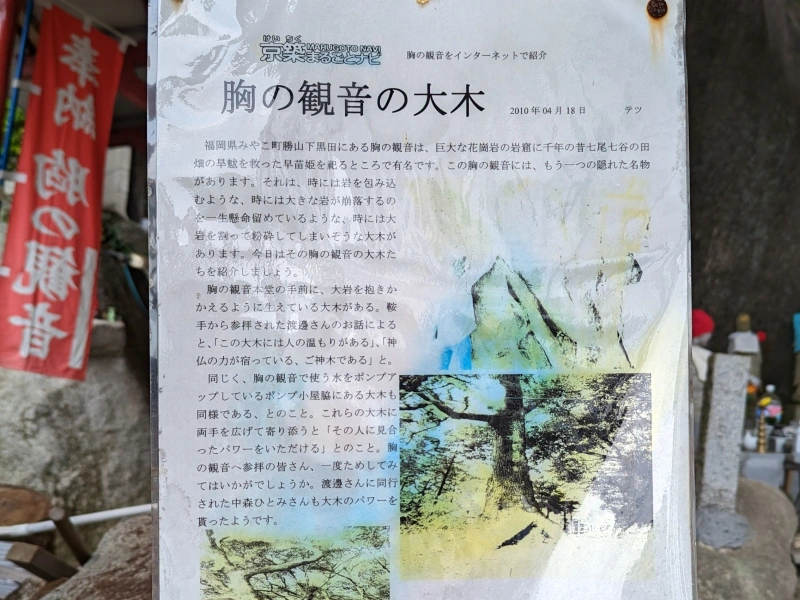 福岡県京都郡みやこ町の観光スポット、「胸の観音」。近くで別用を済ませたついでに寄ってみたのですが、素晴らしいパワースポットでとても”ついで”に行くようなところではありませんでした。特にスゴいと感じたのが大木のパワー。手を当てると木の脈動が伝わり、身体が浄化されていくのを実感できるほどでした。