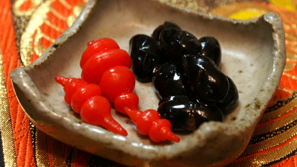 おせち料理に入っている赤い巻貝のような食べ物「ちょろぎ」。
