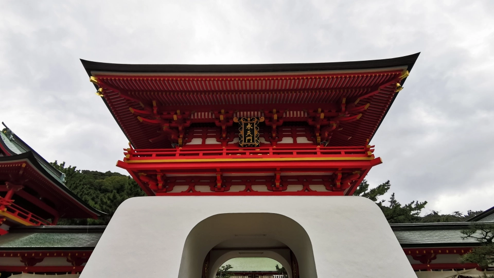 赤間神宮の始まりは、貞観元(859)年に開かれた阿弥陀寺。建久2(1191)年に後鳥羽天皇の勅命により御影堂が建立され、江戸時代までは安徳天皇御影堂と呼ばれていました。明治時代の神仏分離政策によって神社となり、天皇社と改称。明治8(1875)年に赤間宮、昭和15(1940)年に現在の赤間神宮へと改称されました。第二次世界大戦で消失し、現在の社殿は昭和40(1965)年に再建されたものです。朱色の水天門は社殿の再建よりも早く、昭和32(1157)年に龍宮城をイメージして建立されました。