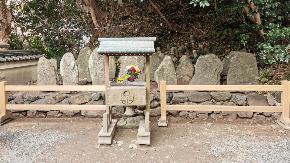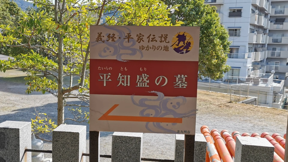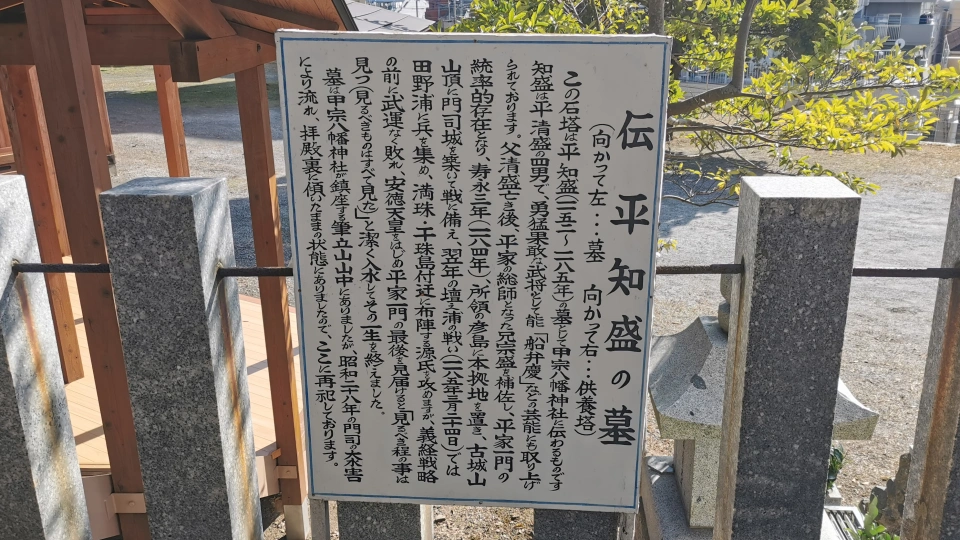 壇ノ浦の合戦後、知盛卿の遺体は門司関へ漂着し、これを憐れんだ里人によって壇ノ浦を見渡せる筆立山に葬られたと伝わります。その後数百年の間、門司港の人々によって墓と供養塔は守られ続けていましたが、昭和28年(1953年)の水害の際に麓へ流出した為、現在は当社社殿横に遷座し、静かに現在の門司港の街を見守り続けています。