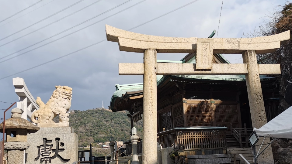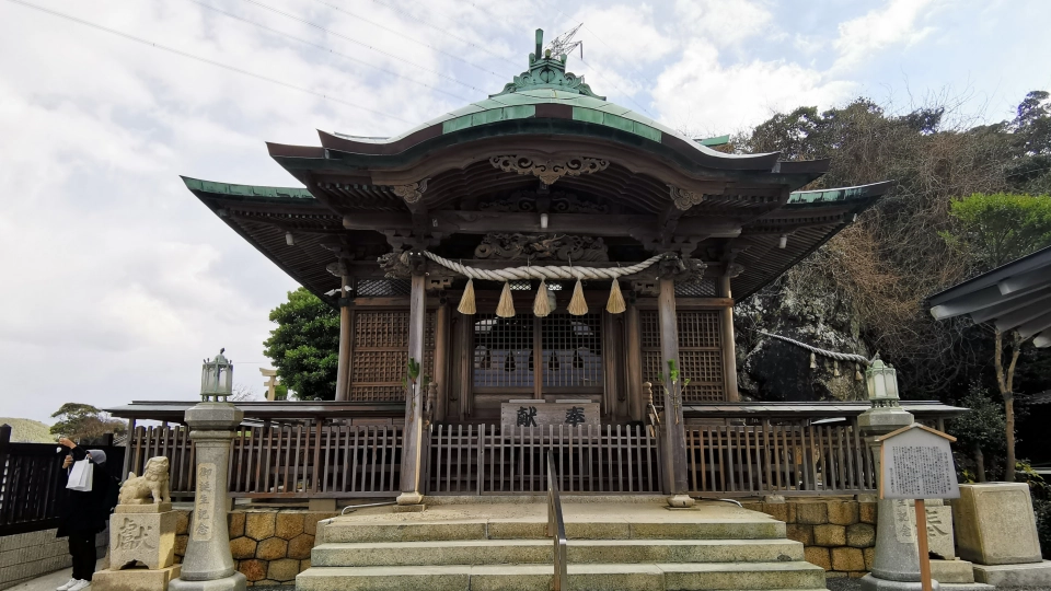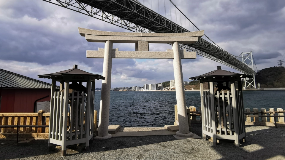 ノーフォーク広場から関門海峡を眺めながら歩くこと10分、和布刈神社に到着。吉川英治の歴史小説『新・平家物語』に、壇ノ浦の合戦前夜、平家一門が戦勝を祈願して酒宴を開いたと記されている神社です。このエピソードは大本の『平家物語』には記載がなく、和布刈神社の公式サイトでも言及されていないため、事実かどうかはわかりません。が、和布刈神社は仲哀天皇9年に創建され、約1,800年もの歴史があるそうです。平家と何かしらの関連があってもおかしくないと思います。